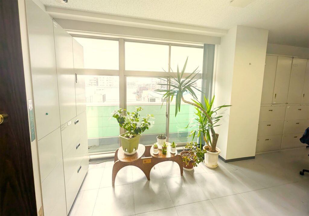 社内にあった植物を集め、ささやかながらヒーリングスペースを設けました。女性社員から好評です。