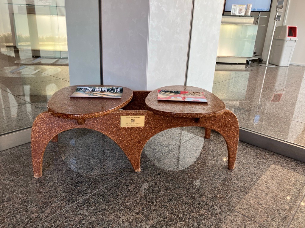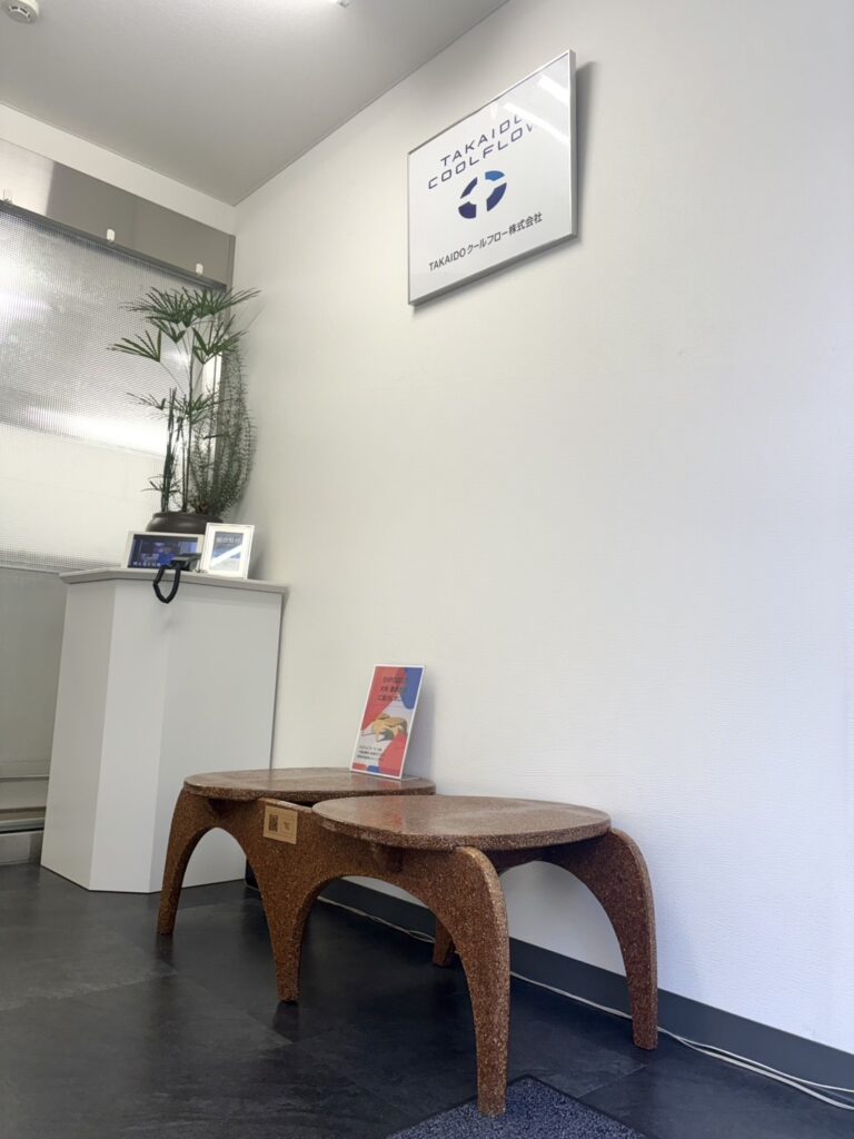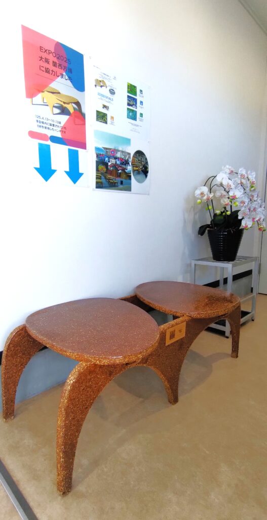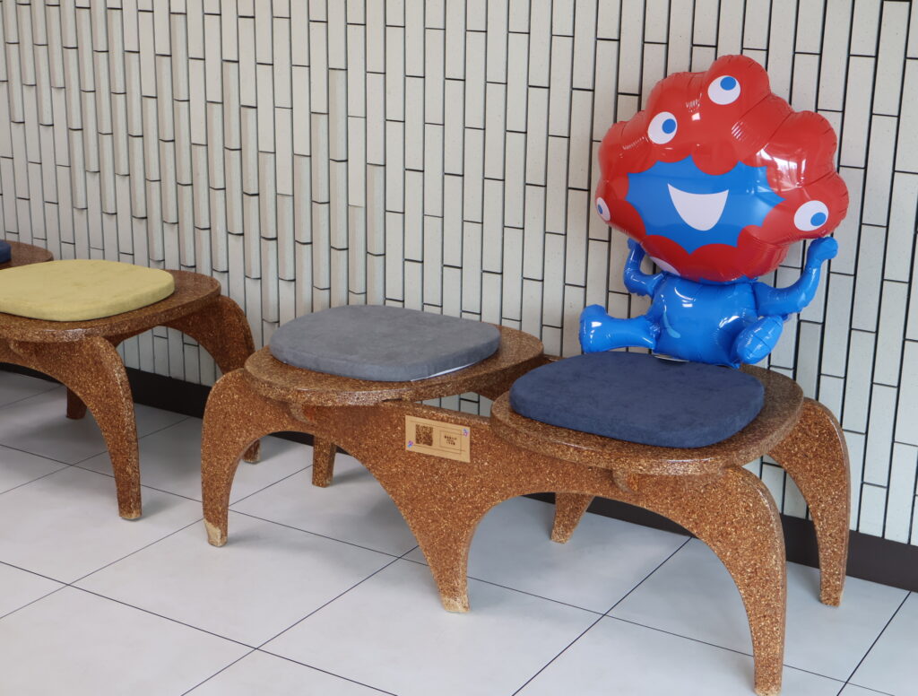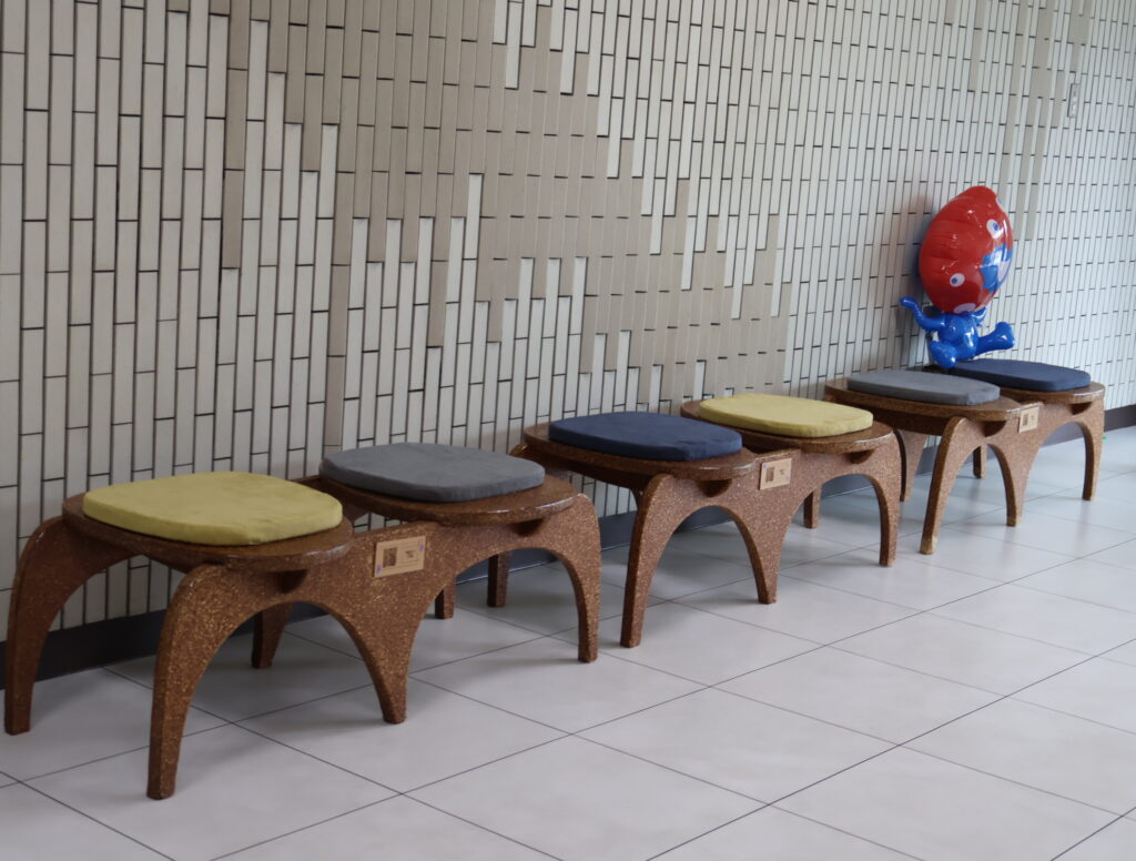 訪問してくださった皆様を、応接室・会議室にご案内するまでの間お待ちいただく受付に3台設置しています 冬季は座面が冷たいためクッションを設置。また、万博で活用されたことをお伝えするアイコンとして、ミャクミャクも添えています。デジタルサイネージを活用して椅子の説明文を投影し、お待ちいただいている間にご覧いただいています。
