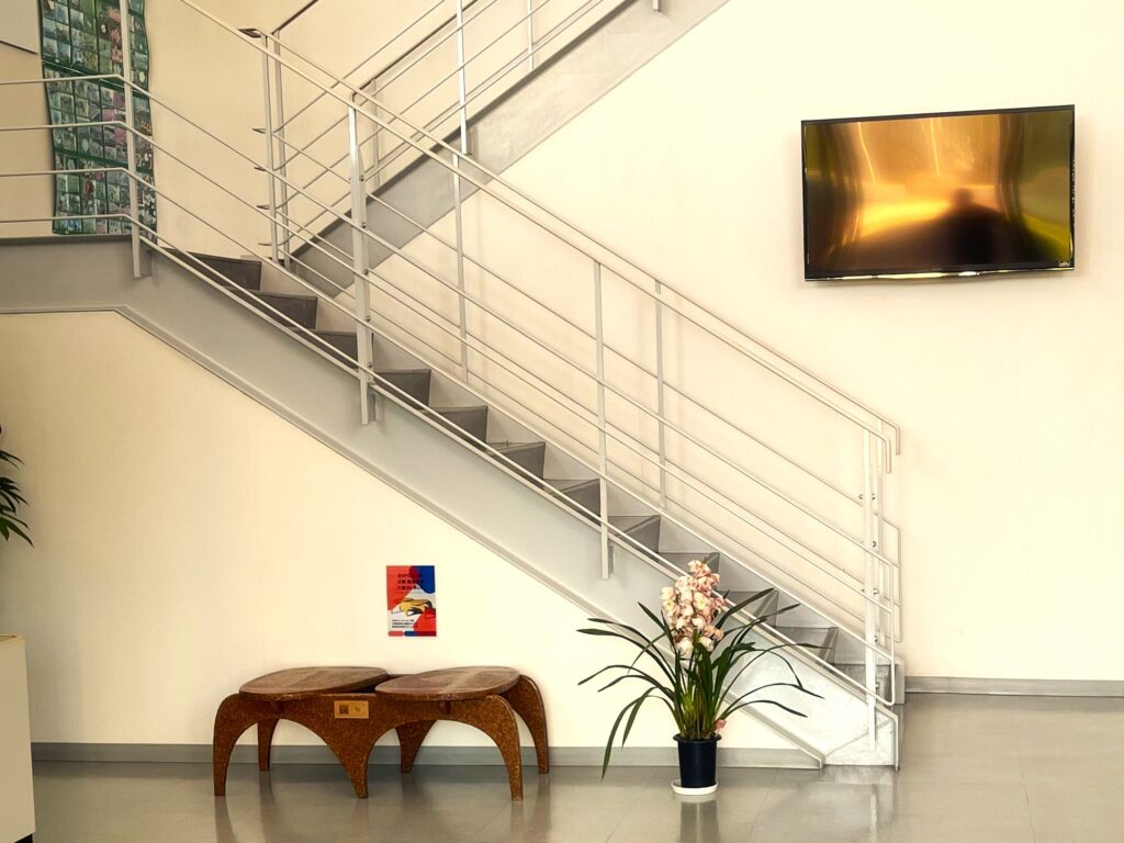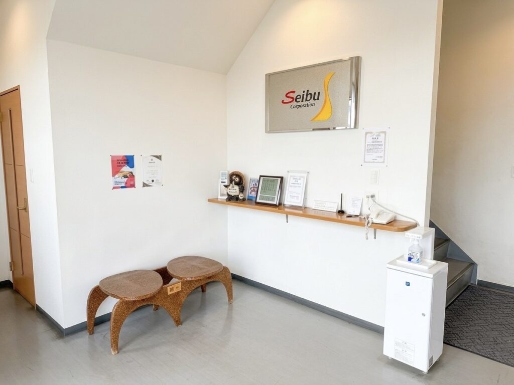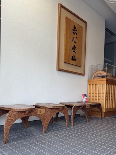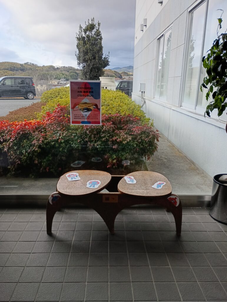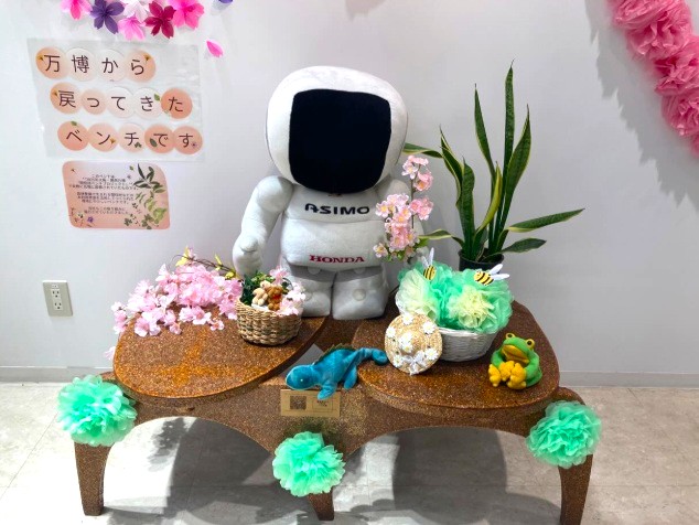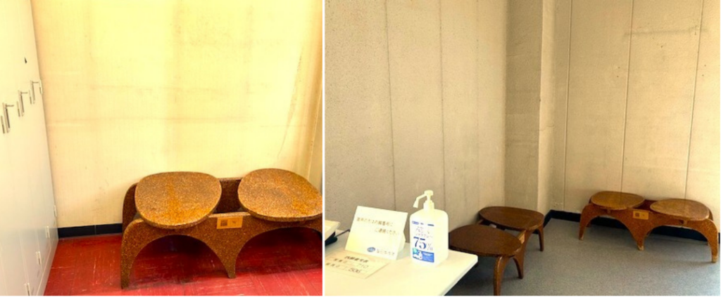 訪問してくださった皆様を、応接室・会議室にご案内するまでの間お待ちいただく受付に3台設置しています 冬季は座面が冷たいためクッションを設置。また、万博で活用されたことをお伝えするアイコンとして、ミャクミャクも添えています。デジタルサイネージを活用して椅子の説明文を投影し、お待ちいただいている間にご覧いただいています。