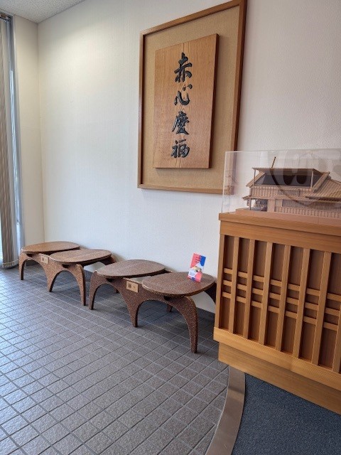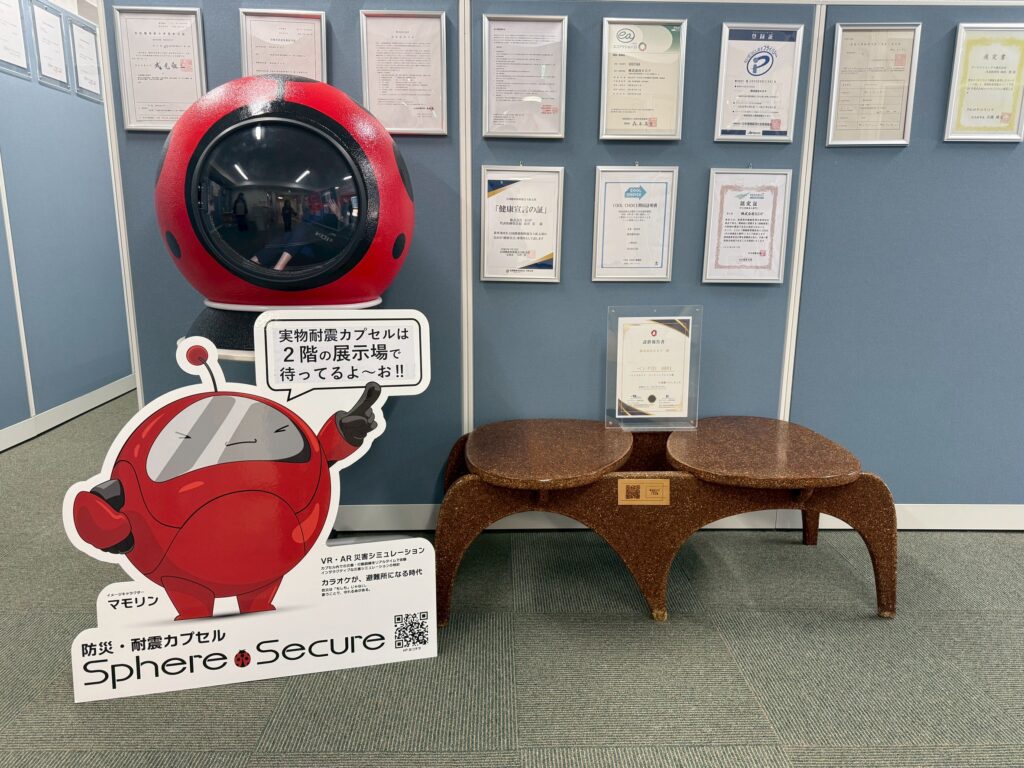 弊社が万博へ出展させていただいた耐震カプセルのミニ模型とともに設置しております。