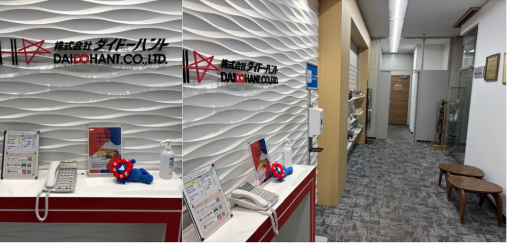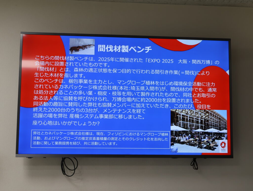 ご来社いただくお客様や社員の目に触れる場所に設置することで、万博における取り組みや環境配慮の活動を紹介する良い機会となっております。