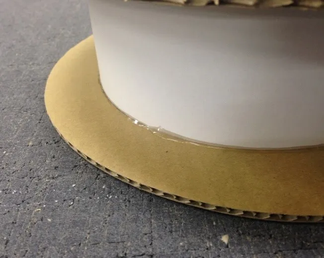 現行品は紙管を糊により貼り付け。糊付けなど組み立てには時間と手間がかかっており、オール段ボール化することで組み立て作業の改善を求められていた。