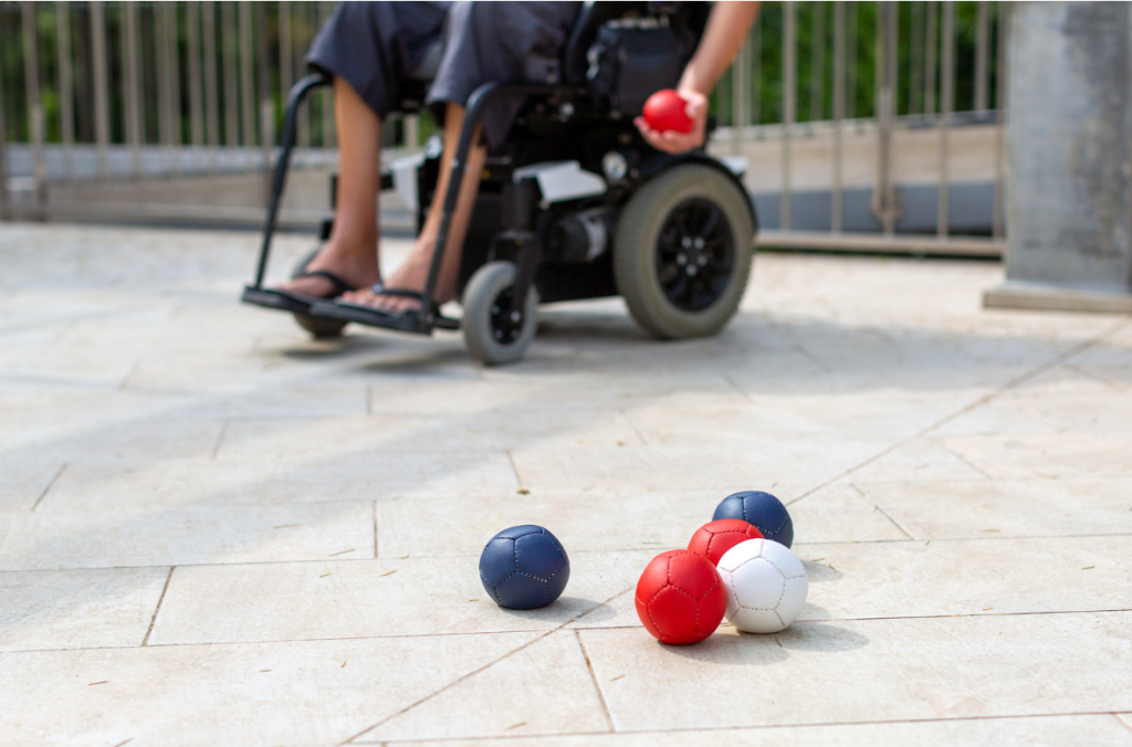 ジャックボール(目標球)と呼ばれる白いボールに、赤・青のそれぞれ6球ずつのカラーボールを投げたり、転がしたり、他のボールに当てたりして、いかに近づけるかを競います。障害によりボールを投げることができなくても、勾配具(ランプス)を使い、自分の意思を介助者に伝えることができれば参加できます。