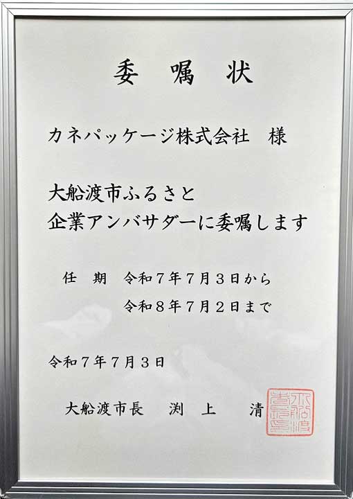 2025年7月3日(木)、岩手県大船渡市役所で“企業版ふるさと納税寄附金贈呈式”及び“ふるさと企業アンバサダー委嘱状交付式”が執り行われ、代表取締役社長 金坂が出席いたしました。