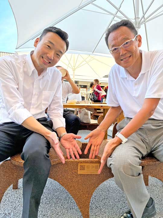 2025年7月28日(月)、入間市の杉島市長が大阪・関西万博を訪れ、来場者の休憩エリアに設置された間伐材ベンチを視察されました。