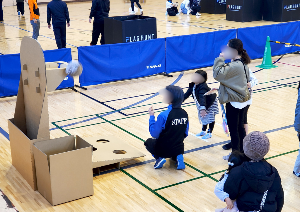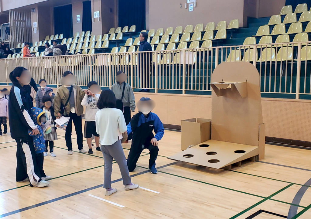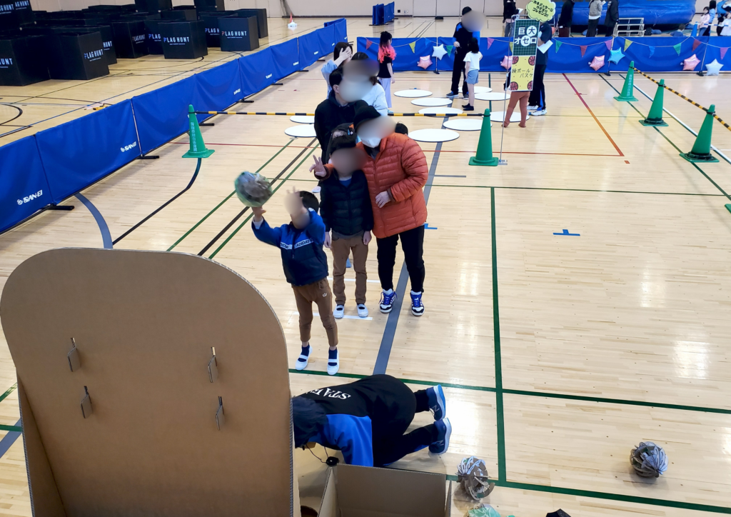 - 段ボールバスケ: ボール(こちらも段ボール製!)を持って狙いを定め、見事にシュート!周りのスタッフさんたちも一緒に盛り上がってくれました。