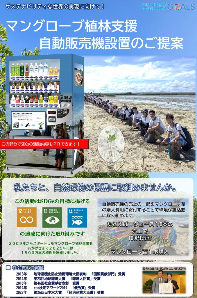 カネパッケージは、売上の一部がマングローブ植樹の寄付になる「空気を綺麗にする夢の自動販売機」の設置を推進しています。 この自販機で飲み物を買うたび、その想いがフィリピンの苗木となって、未来へと植えられていきます。