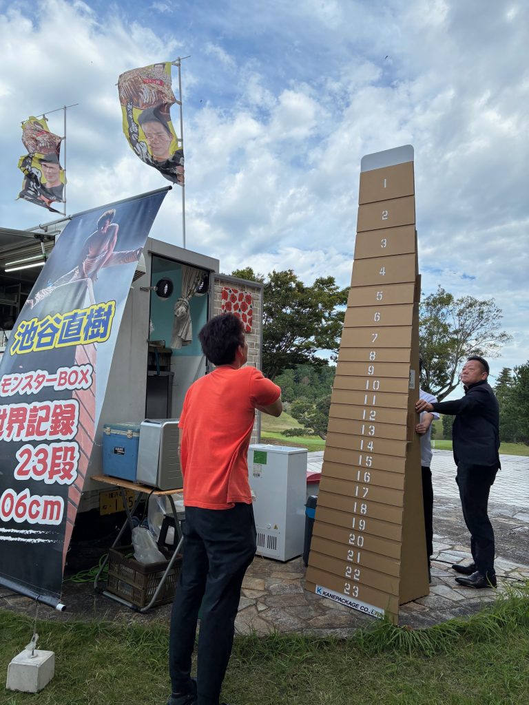 先日、9月29日にベルセルバカントリーにて開催された「池谷幸雄様 55歳誕生日ゴルフコンペ」にて、私たちは、モンスターボックス世界記録保持者である池谷直樹さん(跳び箱23段!)の素晴らしい記録を、誰もが目で見て、肌で感じられるように、段ボール製のオブジェにしてご提供させていただきました。