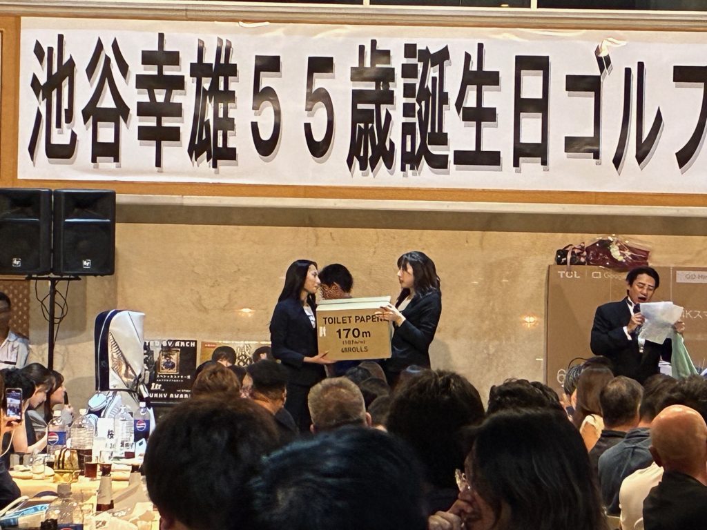 コンペ後のパーティーでは、カネパッケージから『トイレットペーパー1年分』を贈呈!意外ながらも実用的なプレゼントに、受賞者も会場も思わず笑顔に。パーティーを一層盛り上げる、楽しい贈呈シーンとなりました。